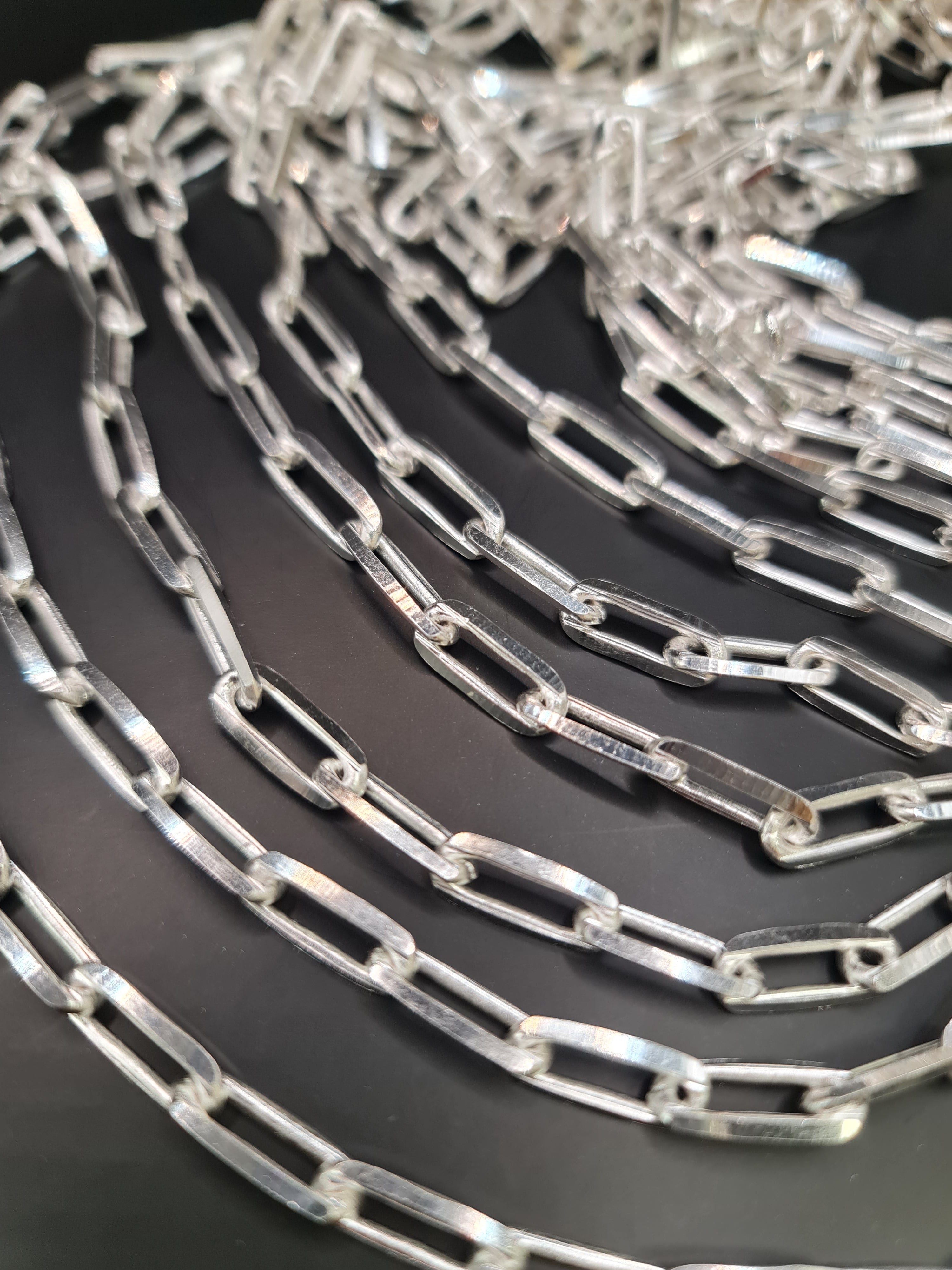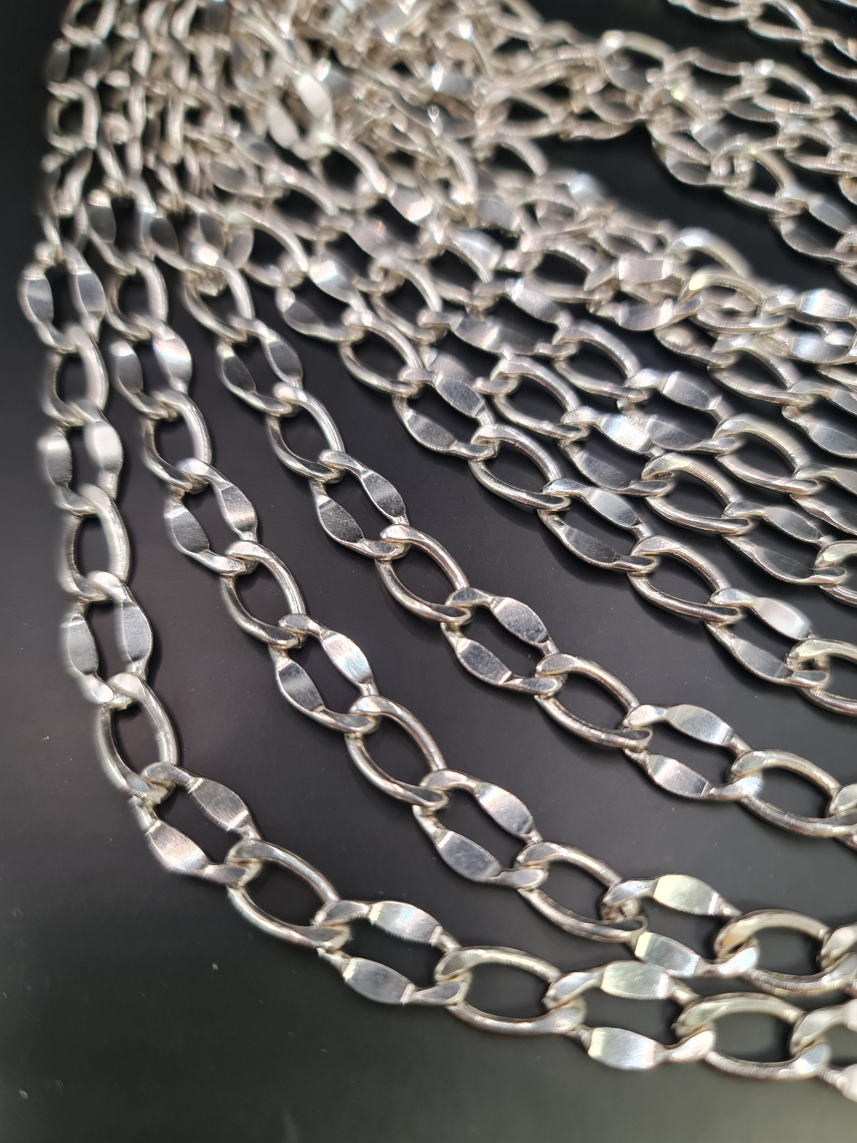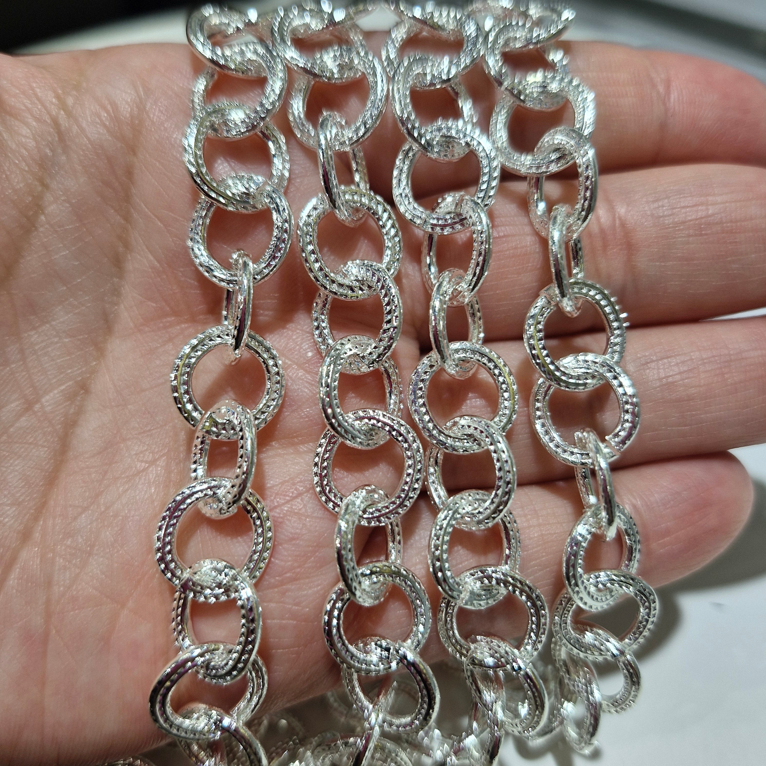 Eslabon estilo óvalos con diseño de martillado. Ventas solo por metros de cadenas.Precio regular $12.500Precio en oferta $12.500 Precio regularPrecio unitario / por -